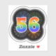 This fun, exciting sticker design features a colorful bursting celebratory fireworks inspired pattern, along with the number "56" featuring a multicolored rainbow like spectrum or gradient pattern. An exciting sticker like this might be used when celebrating somebody’s fifty sixth birthday, or perhaps a couple’s fifty sixth wedding anniversary, or some other 56th event. [~Z0000362]