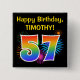 This fun, vibrant button design features a colorful pattern inspired by bursting celebratory fireworks, along with the number "57" having a multicolored rainbow like spectrum or gradient pattern. It also features a custom name and event message, such as a "Happy Birthday" birthday greeting. A button like this might be worn by the attendees at a birthday party being held in celebration of somebody’s fifty seventh birthday. [~Z0000334]