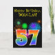 The front of this fun, vibrant birthday greeting card design features a colorful pattern inspired by celebratory fireworks, along with the number "57" having a multicolored rainbow inspired gradient pattern, on a black colored background. The front also features a birthday greeting message, including a personalized recipient name. The inside features a customizable birthday greeting message, or could perhaps be cleared and left blank if a message is to be written by hand instead. A customizable birthday card like this might be a fun way to send birthday wishes to somebody who is celebrating their fifty seventh birthday. [~Z0000330]