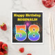 This fun, vibrant paper napkin design features a colorful pattern inspired by celebratory fireworks, along with the number "58" featuring a multicolored rainbow like gradient pattern, on a black colored background. It also features a customizable name and event message. Paper napkins like this could perhaps be used at a party being held to celebrate somebody’s fifty eighth birthday. [~Z0000326]