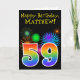 The front of this fun, vibrant birthday greeting card design features a colorful celebratory fireworks inspired pattern, along with the number "59" featuring a multicolored rainbow like gradient pattern, on a black colored background. The front also features a birthday greeting message, including a customizable recipient name. The inside features a customized birthday greeting message, or could perhaps be cleared and left blank if a message is to be written by hand instead. A birthday card like this might be a fun way to send birthday wishes to somebody who is celebrating their fifty ninth birthday. [~Z0000330]