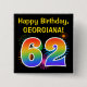 This fun, vibrant button design features a colorful bursting celebratory fireworks inspired pattern, along with the number "62" featuring a multicolored rainbow like spectrum or gradient pattern. It also features a personalized name and event message, such as a "Happy Birthday" birthday greeting. A button like this might be worn by the guests at a birthday party being held to celebrate somebody’s sixty second birthday. [~Z0000334]