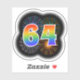 This fun, exciting sticker design features a colorful pattern inspired by bursting celebratory fireworks, along with the number "64" having a multicolored rainbow inspired spectrum or gradient pattern. A sticker like this might be fun to use when celebrating somebody’s sixty fourth birthday, or perhaps a couple’s sixty fourth wedding anniversary, or some other 64th event. [~Z0000362]