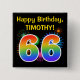 This fun, vibrant button design features a colorful pattern inspired by bursting celebratory fireworks, along with the number "66" having a multicolored rainbow like spectrum or gradient pattern. It also features a personalized name and event message, such as a "Happy Birthday" birthday greeting. A button like this might be worn by the attendees at a birthday party being held to celebrate somebody’s sixty sixth birthday. [~Z0000334]