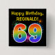 This fun, vibrant button design features a colorful pattern inspired by bursting celebratory fireworks, along with the number "69" having a multicolored rainbow like spectrum or gradient pattern. It also features a personalized name and event message, such as a "Happy Birthday" birthday greeting. A button like this might be worn by the guests at a birthday party being held in celebration of somebody’s sixty ninth birthday. [~Z0000334]