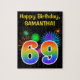 This fun, vibrant puzzle design features a colorful pattern inspired by celebratory fireworks, along with the number "69" featuring a multicolored rainbow inspired gradient pattern, on a black colored background. It also features a personalized name and event message, such as a birthday greeting. A puzzle like this might be a fun way to send a greeting message in celebration of somebody’s sixty ninth birthday. [~Z0000329]