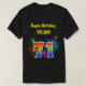 This fun, vibrant shirt design features a colorful pattern inspired by bursting celebratory fireworks, along with the number "71" featuring a multicolored rainbow inspired spectrum or gradient pattern. It also features a customizable name and event message, such as a "Happy Birthday" birthday greeting. A shirt like this might be worn by the attendees at a birthday party being held to celebrate somebody’s seventy first birthday. [~Z0000332]