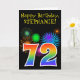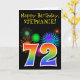 The front of this fun, vibrant birthday greeting card design features a colorful celebratory fireworks inspired pattern, along with the number "72" having a multicolored rainbow inspired gradient pattern, on a black colored background. The front also features a birthday greeting message, including a custom recipient name. The inside features a custom birthday greeting message, or could perhaps be cleared and left blank if a message is to be written by hand instead. A custom birthday card like this might be a fun way to send birthday wishes to somebody who is celebrating their seventy second birthday. [~Z0000330]