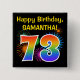 This fun, vibrant button design features a colorful pattern inspired by bursting celebratory fireworks, along with the number "73" having a multicolored rainbow like spectrum or gradient pattern. It also features a customizable name and event message, such as a "Happy Birthday" birthday greeting. A button like this might be worn by the guests at a birthday party being held in celebration of somebody’s seventy third birthday. [~Z0000334]