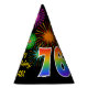 This fun, vibrant birthday party hat design features a colorful bursting celebratory fireworks inspired pattern, along with the number "76" featuring a multicolored rainbow like spectrum or gradient pattern. It also features a custom name and event message, such as a "Happy Birthday" birthday greeting. A birthday-themed paper hat like this might be worn by the attendees at a birthday party being held in celebration of somebody’s seventy sixth birthday. [~Z0000333]