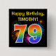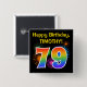 This fun, vibrant button design features a colorful bursting celebratory fireworks inspired pattern, along with the number "79" having a multicolored rainbow like spectrum or gradient pattern. It also features a personalized name and event message, such as a "Happy Birthday" birthday greeting. A button like this might be worn by the attendees at a birthday party being held to celebrate somebody’s seventy ninth birthday. [~Z0000334]