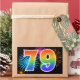 This fun, vibrant sticker design features a colorful celebratory fireworks inspired pattern, along with the number "79" featuring a multicolored rainbow like gradient pattern, on a black colored background. Stickers like this could perhaps be given as a small gift while celebrating somebody’s seventy ninth birthday, or perhaps for a couple’s seventy ninth wedding anniversary, or some other 79th event. [~Z0000324]