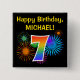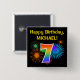This fun, vibrant button design features a colorful pattern inspired by bursting celebratory fireworks, along with the number "7" having a multicolored rainbow like spectrum or gradient pattern. It also features a custom name and event message, such as a "Happy Birthday" birthday greeting. A button like this might be worn by the attendees at a birthday party being held to celebrate somebody’s seventh birthday. [~Z0000334]