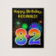 This fun, vibrant puzzle design features a colorful celebratory fireworks inspired pattern, along with the number "82" having a multicolored rainbow like gradient pattern, on a black colored background. It also features a personalized name and event message, such as a birthday greeting. A puzzle like this might be a fun way to send a birthday message to acknowledge somebody’s eighty second birthday. [~Z0000329]
