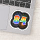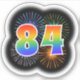 This fun, exciting sticker design features a colorful pattern inspired by bursting celebratory fireworks, along with the number "84" featuring a multicolored rainbow inspired spectrum or gradient pattern. A sticker like this might be used when celebrating somebody’s eighty fourth birthday, or perhaps a couple’s eighty fourth wedding anniversary, or some other 84th event. [~Z0000362]