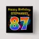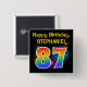 This fun, vibrant button design features a colorful bursting celebratory fireworks inspired pattern, along with the number "87" having a multicolored rainbow like spectrum or gradient pattern. It also features a customizable name and event message, such as a "Happy Birthday" birthday greeting. A button like this might be worn by the guests at a birthday party being held in celebration of somebody’s eighty seventh birthday. [~Z0000334]