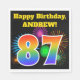 This fun, vibrant paper napkin design features a colorful pattern inspired by celebratory fireworks, along with the number "87" having a multicolored rainbow like gradient pattern, on a black colored background. It also features a custom name and event message. Paper napkins like this might be used at a birthday party being held to celebrate somebody’s eighty seventh birthday. [~Z0000326]