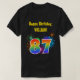 This fun, vibrant shirt design features a colorful bursting celebratory fireworks inspired pattern, along with the number "87" having a multicolored rainbow like spectrum or gradient pattern. It also features a personalized name and event message, such as a "Happy Birthday" birthday greeting. A shirt like this might be worn by the attendees at a birthday party being held to celebrate somebody’s eighty seventh birthday. [~Z0000332]