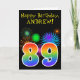 The front of this fun, vibrant birthday greeting card design features a colorful pattern inspired by celebratory fireworks, along with the number "89" featuring a multicolored rainbow like gradient pattern, on a black colored background. The front also features a birthday greeting message, including a customized recipient name. The inside features a customizable birthday greeting message, or could perhaps be cleared and left blank if a message is to be written by hand instead. A personalized birthday card like this might be a fun way to send a message in celebration of somebody’s eighty ninth birthday. [~Z0000330]