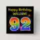 This fun, vibrant button design features a colorful pattern inspired by bursting celebratory fireworks, along with the number "92" featuring a multicolored rainbow inspired spectrum or gradient pattern. It also features a personalized name and event message, such as a "Happy Birthday" birthday greeting. A button like this might be worn by the guests at a birthday party being held in celebration of somebody’s ninety second birthday. [~Z0000334]