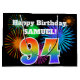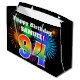 This fun, vibrant gift bag design features a colorful pattern inspired by celebratory fireworks, along with the number "94" having a multicolored rainbow inspired gradient pattern, on a black colored background. It also features a customizable name and event message, such as a birthday greeting. A gift bag like this might be used to wrap a present or gift being given in celebration of somebody’s ninety fourth birthday. [~Z0000328]