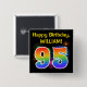 This fun, vibrant button design features a colorful pattern inspired by bursting celebratory fireworks, along with the number "95" having a multicolored rainbow inspired spectrum or gradient pattern. It also features a custom name and event message, such as a "Happy Birthday" birthday greeting. A button like this might be worn by the guests at a birthday party being held to celebrate somebody’s ninety fifth birthday. [~Z0000334]