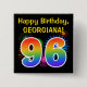 This fun, vibrant button design features a colorful pattern inspired by bursting celebratory fireworks, along with the number "96" featuring a multicolored rainbow like spectrum or gradient pattern. It also features a personalized name and event message, such as a "Happy Birthday" birthday greeting. A button like this might be worn by the attendees at a birthday party being held to celebrate somebody’s ninety sixth birthday. [~Z0000334]