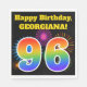 This fun, vibrant paper napkin design features a colorful celebratory fireworks inspired pattern, along with the number "96" having a multicolored rainbow like gradient pattern, on a black colored background. It also features a personalized name and event message. Paper napkins like this could perhaps be used at a birthday party being held to celebrate somebody’s ninety sixth birthday. [~Z0000326]