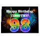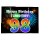 This fun, vibrant gift bag design features a colorful pattern inspired by celebratory fireworks, along with the number "98" having a multicolored rainbow inspired gradient pattern, on a black colored background. It also features a personalized name and event message, such as a birthday greeting. A fun gift bag like this could be used when wrapping a present or gift being given in celebration of somebody’s ninety eighth birthday. [~Z0000328]