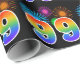 This fun, vibrant wrapping paper design features a colorful pattern inspired by celebratory fireworks, along with the number "99" having a multicolored rainbow inspired gradient pattern, on a black colored background. Wrapping paper like this might be used when wrapping gifts or presents being given for somebody’s ninety ninth birthday, or perhaps for a couple’s ninety ninth wedding anniversary, or some other 99th event. [~Z0000322]