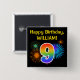 This fun, vibrant button design features a colorful pattern inspired by bursting celebratory fireworks, along with the number "9" featuring a multicolored rainbow inspired spectrum or gradient pattern. It also features a custom name and event message, such as a "Happy Birthday" birthday greeting. A button like this might be worn by the guests at a birthday party being held in celebration of somebody’s ninth birthday. [~Z0000334]