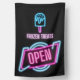 Fun neon outdoor flag for businesses that sell frozen treats. Design features a colorful neon frozen treat on a stick with retro-style neon "Open". Great advertisement for brick-and-mortar stores, food carts, and event concession stands.