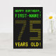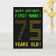 The front of this nerdy, personalized birthday card design features the messages "HAPPY BIRTHDAY" and "75 YEARS OLD!", along with a editable recipient name. The messages on the front have an appearance inspired by pixelated retro video games. The digits of the large number "75" on the front consist of smaller sized "7" or "5" digits, giving an ASCII art inspired look. The inside features a birthday greeting message that can be personalized. A geeky style, personalized birthday greeting card like this might be a special way to send a birthday message to somebody celebrating their 75th birthday. [~Z0000366]