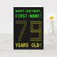 The front of this nerdy, customizable birthday card design features the messages "HAPPY BIRTHDAY" and "79 YEARS OLD!", along with a personalized recipient name. The messages on the front have a look inspired by pixelated retro video games. The digits of the large number "79" on the front consist of smaller sized "7" or "9" digits, giving an ASCII art inspired look. The inside features a birthday greeting message that can be customized. A geeky style, customized birthday greeting card like this might be a silly way to send birthday wishes to somebody who is celebrating their 79th birthday. [~Z0000366]