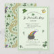 This fun St. Patrick's Day lunch invitation features hand-drawn illustrations of a rainbow and pot of gold with shamrock gold coins, a leprechaun hat, a green clover, golden horseshoe, and adorable green hearts. The back features a beautiful pattern with these same elements, and an Irish blessing, "Wishing you endless luck and joy".