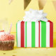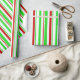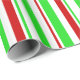 This wrapping paper design features Christmas themed stripes colored red, white, and green. Wrapping paper like this might be used when wrapping presents or gifts being given in celebration of a birthday, a wedding, an anniversary, or some other event.