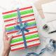 This Christmas-inspired design features a pattern of stripes having colors like red, white, and green. Wrapping paper like this might be used when preparing gifts or presents being given to celebrate a birthday, a wedding, an anniversary, or some other event.