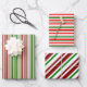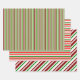 These fun Christmas inspired designs feature stripes colored red, white, and green. Festive wrapping paper sheets like these might be used when wrapping gifts being given to celebrate Christmas.