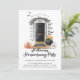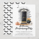 Fun Halloween theme housewarming party invitation. Our design features our own hand-painted watercolor black door with white columns. Accented with grey siding, a natural wooden porch, and a black and white boo! doormat. The front of the house is decorated with Halloween pumpkins, spiderwebs, bats, and a black cauldron flower pot. Customize with your new home house number on the front of the door along with the party details. The back of the Halloween invitation features a fun bat pattern. All illustrations are hand-painted original artwork by Moodthology.