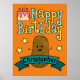 Adorable fun birthday poster to brighten up your party. Over an orange background the design starts from the top with Happy Birthday in green and yellow text with a cake with pink icing and three lit candles next ti the H in happy. Below the text is a cute funny happy brown potato with stick arms and a big smile. Across the potato is a blue banner with a template to add your name to personalize. Finally three yellow stars are dotted around the potato.