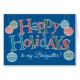 A fun, text-based Happy Holidays card for a Babysitter, with Ornaments and Lettering, filled with red, blue and green chevrons and polka dots, outline in white on a bright blue background. There is also a custom front card with this design in case you can't find a card for the specific recipient you're looking for.