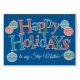 A fun, text-based Happy Holidays card for a Step Mother, with Ornaments and Lettering, filled with red, blue and green chevrons and polka dots, outline in white on a bright blue background. There is also a custom front card with this design in case you can't find a card for the specific recipient you're looking for.