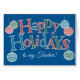 A fun, text-based Happy Holidays card for a Teacher, with Ornaments and Lettering, filled with red, blue and green chevrons and polka dots, outline in white on a bright blue background. There is also a custom front card with this design in case you can't find a card for the specific recipient you're looking for.