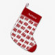 Add a fun custom touch to your holiday living room decor with this adorable Ho Ho Ho pattern Christmas stocking. Stocking has the repeating text Ho Ho Ho in red. Add a first name for a personalized touch. Makes a cute gift for a kid or family member!