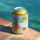 Nothing says summer fun like a day at the. This Can Cooler features a cozy beach chair, in the sand along with a pail and shovel. Above the whimsical sun, in sunglasses. The text reads "Fun In The Sun". The same image is on the front and back. On the bottom of the can cooler there is an image of the sun.
