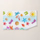Fun and colorful bath towel set with summer pattern. Wide baby blue and white stripes are the background for graphics related to the summer season. Palm trees, seashells, sunglasses and sunshine bring visions of warm days under sunny, blue skies. This bright and cheery design belongs in a summer cottage, teen’s bathroom, or any home near the coast.