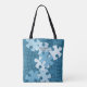 Fun Jigsaw Puzzle Custom Name & Motto Blue Tote Bag features scattered jigsaw pieces against a puzzle pattern with a custom custom name on the front and a motto on the back. All elements are color customizable.