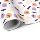 This design features a playful and colorful Halloween pattern with a minimalist design. The pattern includes simple, rounded shapes of jack-o'-lanterns, ghosts, skulls, and bats, all scattered across a white background. The color palette is soft yet vibrant, with pumpkins in shades of orange, ghosts in pale peach, skulls in lavender, and bats in deep purple. Each element has a cute and friendly expression, making the pattern fun and lighthearted, perfect for Halloween decorations or kids' party themes. The overall design is cheerful and festive, capturing the whimsical side of Halloween.