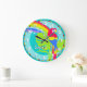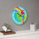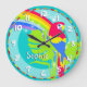 Colourful kids rainbow hues graphic wall clock with graphic macaw parrot bird on palms designed by Sarah Trett. Customise with the short letter name of your choice, this example reads Sophie. Would be a great personalised addition to your child's tropical jungle, wildlife or colorful bedroom.