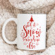 The perfect holiday seasonal Christmas mug with the quote Let It Snow Somewhere Else in a festive red typography script accented with a flurry of snowflakes and a modern Christmas tree.